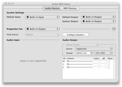 5 separate speaker channels, 1 subwoofer - great DVD surround sound.The Audio MIDI Setup looks a little bit different on Snow Leopard but I chose the same settings. 48000 & 2ch/24.