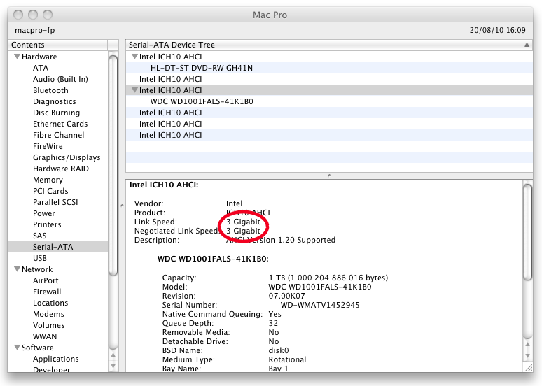 On the screenshot above, you can see a Negatiated Link Speed of 3 Gb/s, which is good... except I made the capture on my Mac Pro. Apparently, 2010 Mac Minis will show you a Link Speed of 3 Gb/s (that's what the Mac is capable of) but a Negotiated Link Speed of only 1.5 Gb/s (that's what the HD is capable of)...